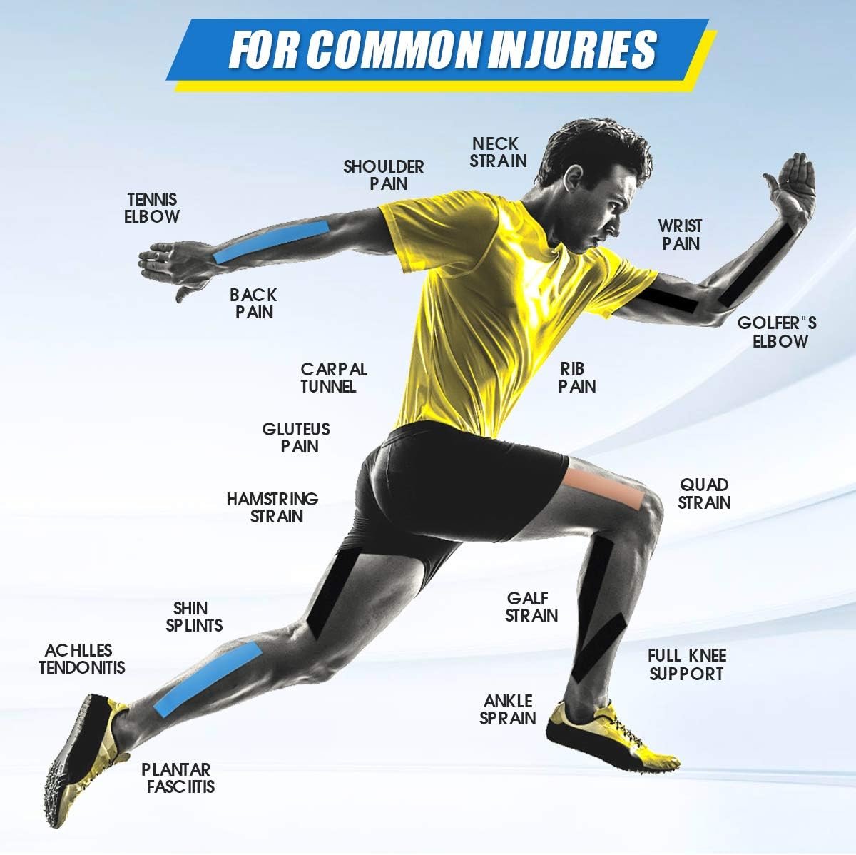 Use N.C.D Kinesiology Tape for: Neck injuries Shoulder pain Plantar fasciitis Gluteus pain Carpal tunnel Tennis elbow Hamstring strain Achilles tendonitis