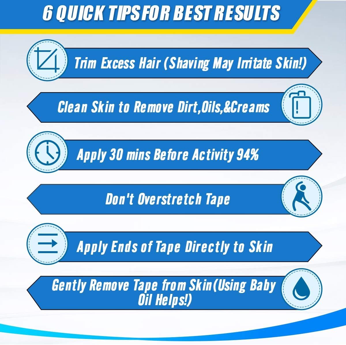 The product contains a detailed Operation Manual, Which can help you use this kinesiology tape correctly according to your different situations in your daily life.