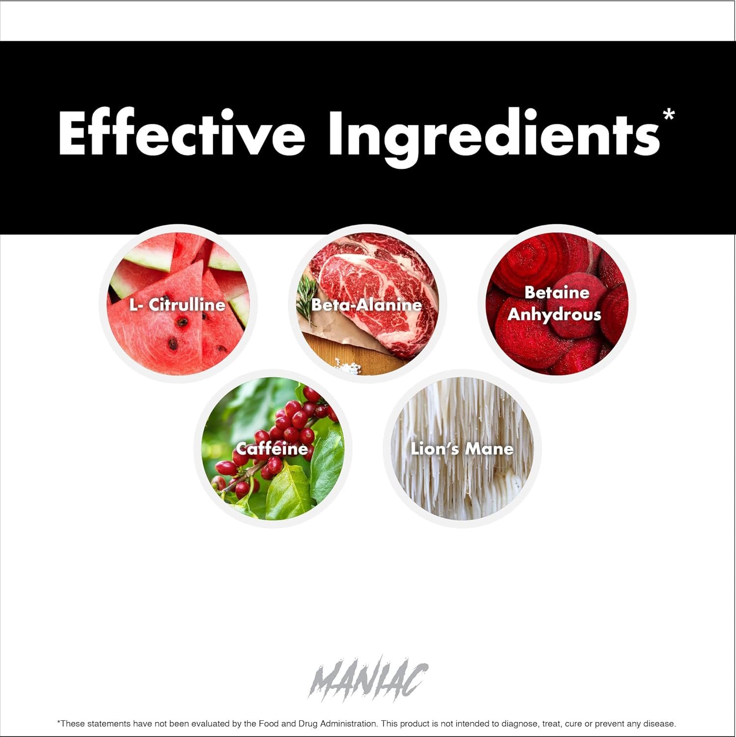 Muscle Growth*: Maniac is carefully formulated with 3G of Beta-Alanine. This clinically studied ingredient supports performance by helping with endurance and muscle fatigue. Unleash your inner maniac with this potent pre-workout powder.*