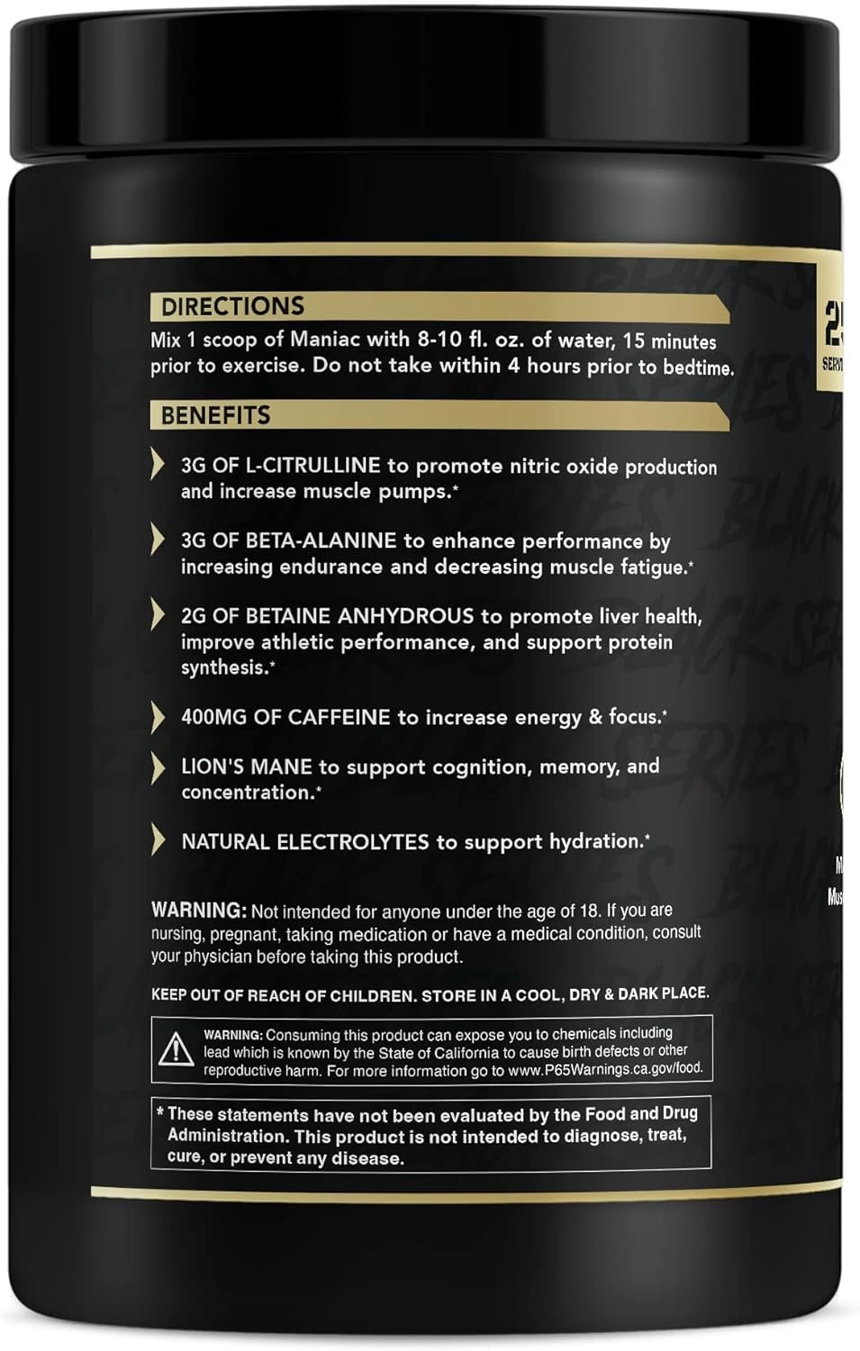 Unmatched Energy* – Don’t settle for a weak pre-workout! Maniac pre-workout powder is super potent and contains 400mg of caffeine to support crazy energy. Not only will this comprehensive pre-workout powder get you moving, but it will also help you stay focused on your training. Maniac contains Lion’s Mane to support cognition and concentration.*Supports Pump* – Are you addicted to the pump? Then throw on your best gym wear and find some good lighting because you are going to want to snap a pic of your post Maniac pump! This pre-workout is packed with 3G of L-Citrulline which supports nitric oxide production and massive muscle pumps.*Just Keep Growing* – Maniac isn’t just a flavored caffeine blend. This pre-workout is carefully formulated with 3G of Beta-Alanine which supports performance by helping with endurance and muscle fatigue. If you’re ready to maximize your muscle growth, then add this to your stack!*Athletic Performance* – You don’t have to be a pro athlete to train like one! Maniac is carefully formulated with 2G of Betaine Anhydrous to support liver health, athletic performance, and protein synthesis.*Stay Hydrated* – When you are crushing a workout, it can be easy to forget to drink enough water, that is until those occasional muscle cramps kick in. Maniac pre-workout powder contains natural electrolytes to support optimum hydration.*
