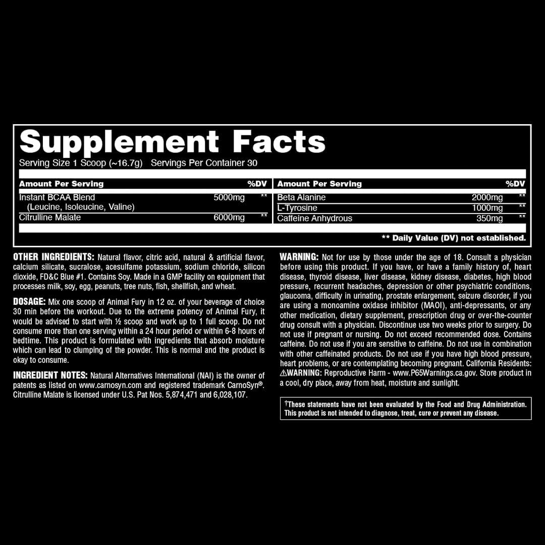 Animal Fury is your ultimate pre-training powerhouse. Designed for intense sessions, this formula packs robust doses of the most potent ingredients, all in a single scoop. Whether you’re new to lifting or a seasoned pro, our preworkout is crafted to optimize your performance, during both bulking and cutting phases. When you’re ready to crush your workout and leave the weights in rubble, Animal Fury ignites your performance. Get ready to elevate your training to explosive new heights with Animal Fury – where power meets performance!
