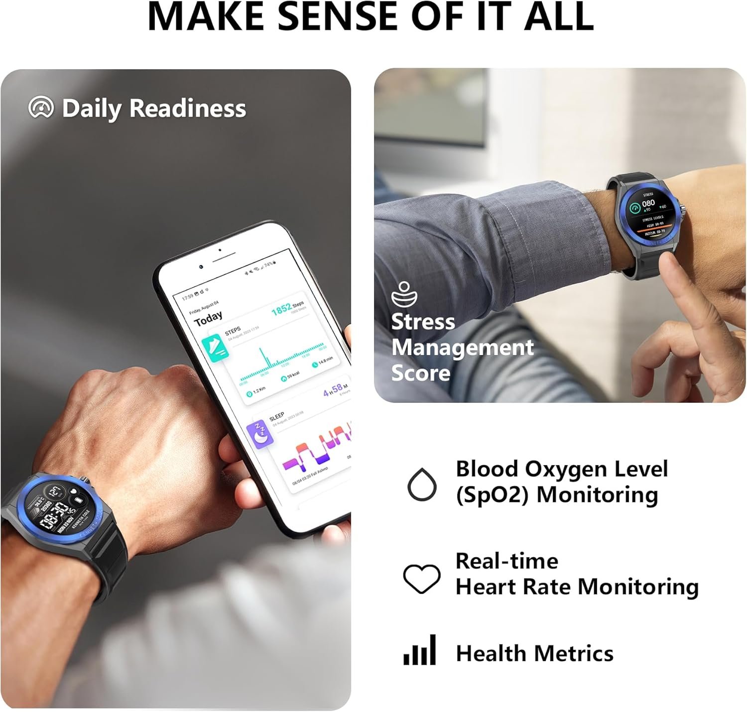 【24/7 health tracking】High-performance optical sensors, the smart watch for Android and iPhone will timely and precisely work as a fitness tracker to record your daily walking steps, distances, calories, continuously monitor your heart rate, blood oxygen, stress, and sleep quality (Deep Sleep, Light Sleep, REM, Awake) with a detailed data-based presentation to analyze and remind your body status and trend from your wrist, give you the advice to help you adjust the lifestyle