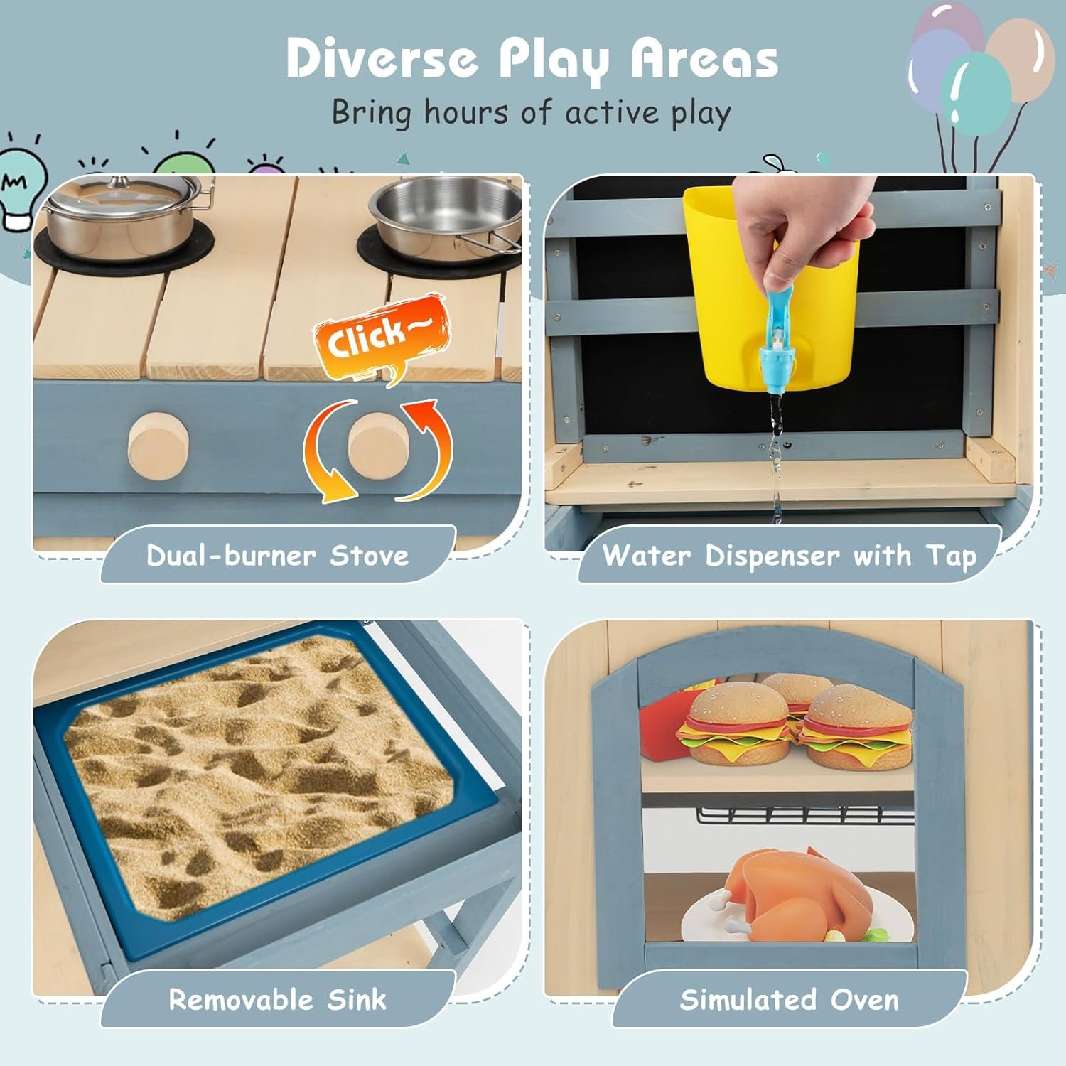 【Perfect Gift for Kids】Featuring a wealth of engaging elements, this mud kitchen for kids outdoor emerges as the ultimate educational gift for children aged 3 and up. It complies with ASTM and CPSIA standards, bringing kids hours of imaginative play and fostering important life skills.