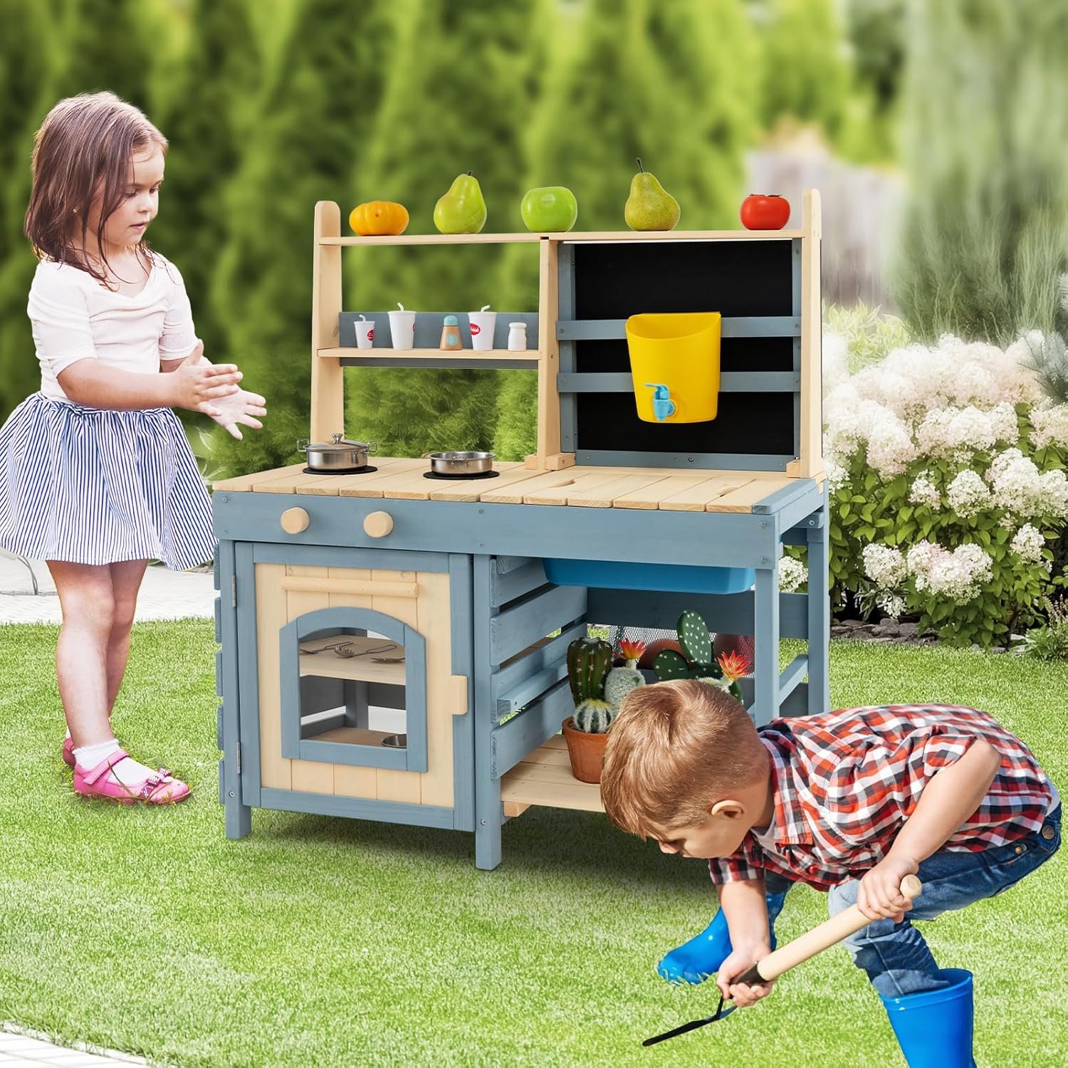 【2-in-1 Double-sided Design】One side of the outdoor playset serves as a mud kitchen where kids can pretend to cook, make mud pies and play water. The other side serves as a grocery store or an ordering area, thus children can enjoy role-play games with parents or friends. This double-sided design enhance kids creative thinking and social skills while enriching their playtime.