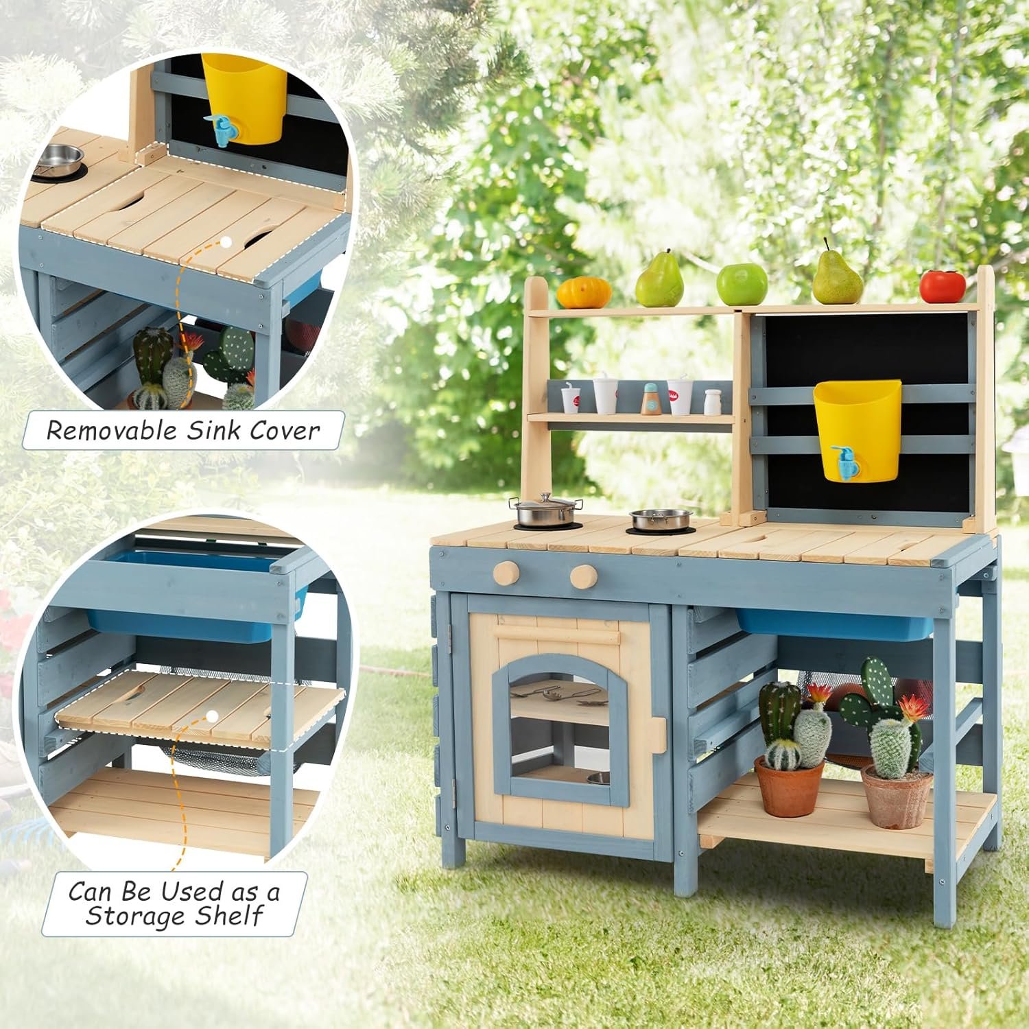 Featuring a double-sided design, this outdoor play kitchen & grocery store offers endless playtime fun for kids aged 3 and up. The durable fir wood construction ensures a safe and long-lasting play experience, along with smooth surface and rounded corners. Additionally, with dual-burner stove, pretend oven, and interactive blackboard, the outdoor mud kitchen will bring hours of active play. Besides, mesh bag and metal baskets makes cleanup a breeze. And the removable sink cover servers as a storage shelf for multifunctional use. Furthermore, this playset is a perfect gift for kids to spark their joy and imagination with every play session.