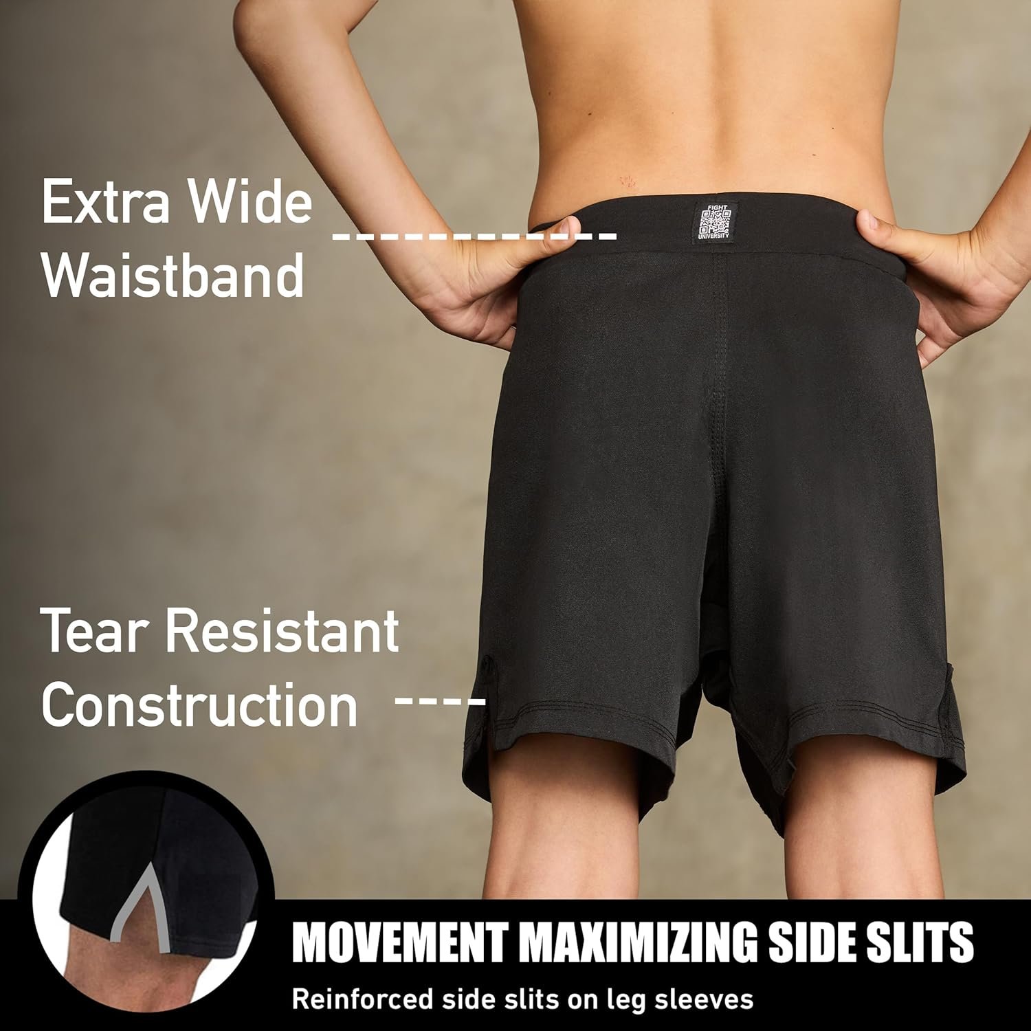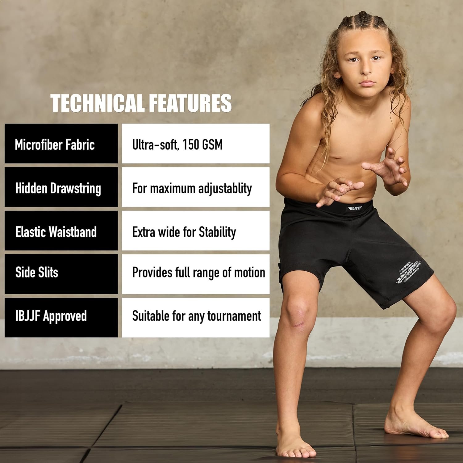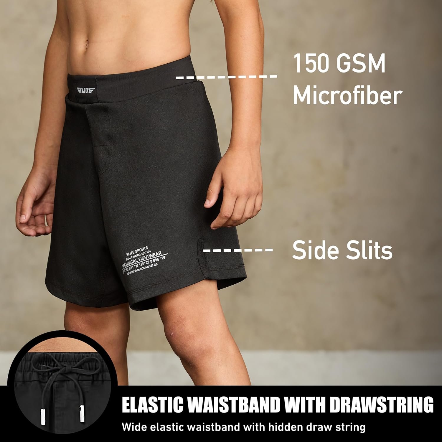 1 Side Slits 2 Worn as No-Gi, MMA, BJJ 3 Microfiber Fabric 4 Elastic Waistband 5 Interlock Drawstrings