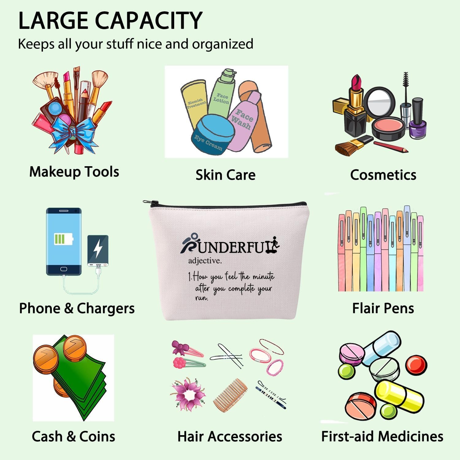 【Multi-function bag】:This cosmetic bag can store not only lipstick, foundation, eye shadow and other cosmetics, but also daily necessities and valuables, such as headphones, keys, camera, shaving kit, etc. It can also contain some daily necessities, such as glasses,Contact eye box, keys, headphones, mobile phone tissue medicine and so on.