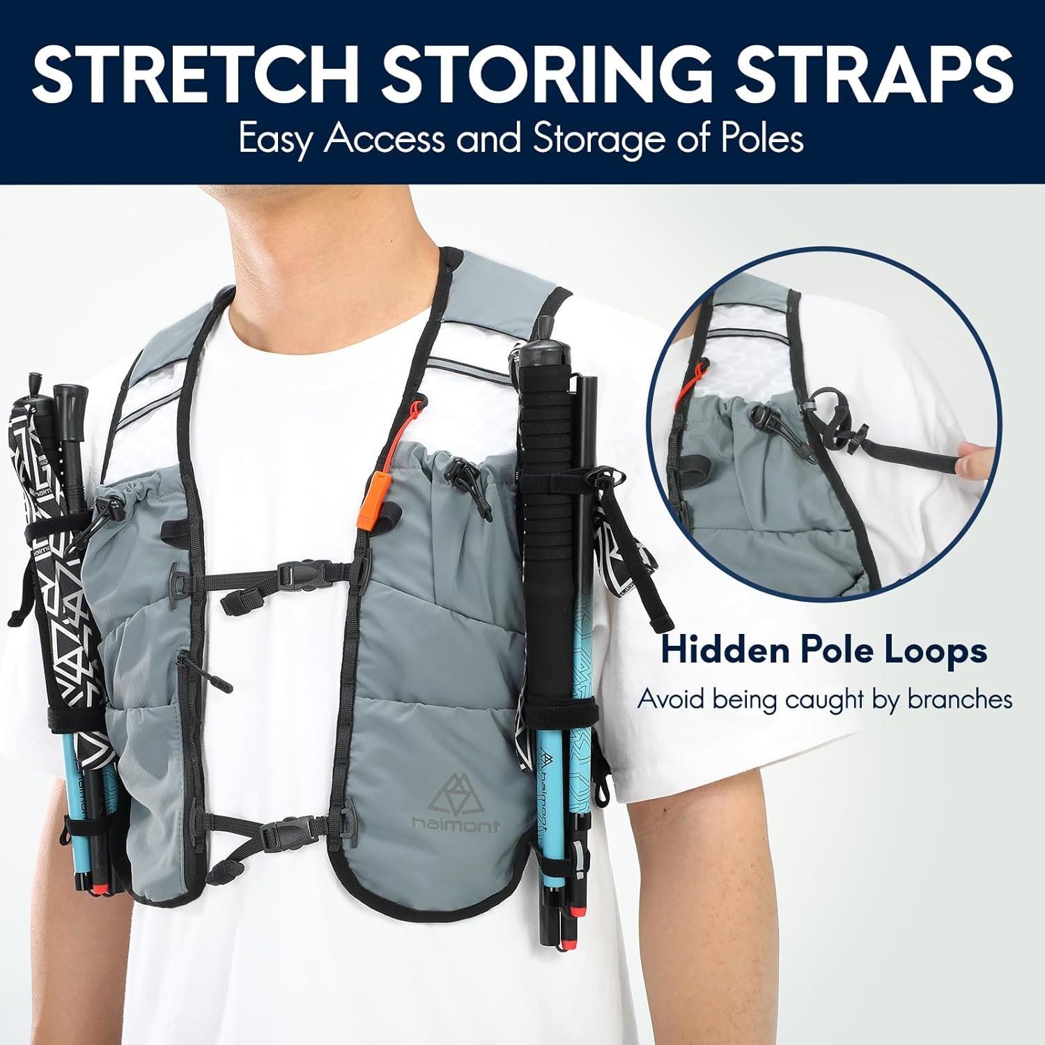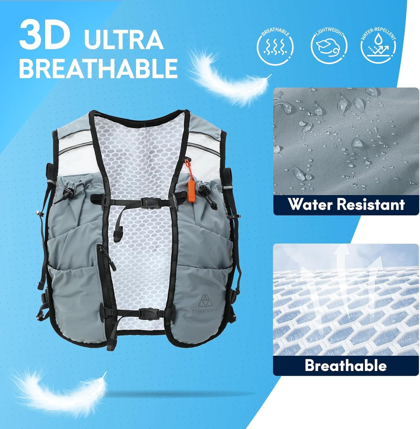 IDEAL FOR OUTDOOR ACTIVITY: 5 L outdoor running vest has lots of storage options, and allows you quick hydration at any time. (Hydration bladder and trekking pole are not included) Haimont running hydration vest aims to accompany your trip of running, marathon, hiking, climbing, racing, trail, all-terrain races, etc