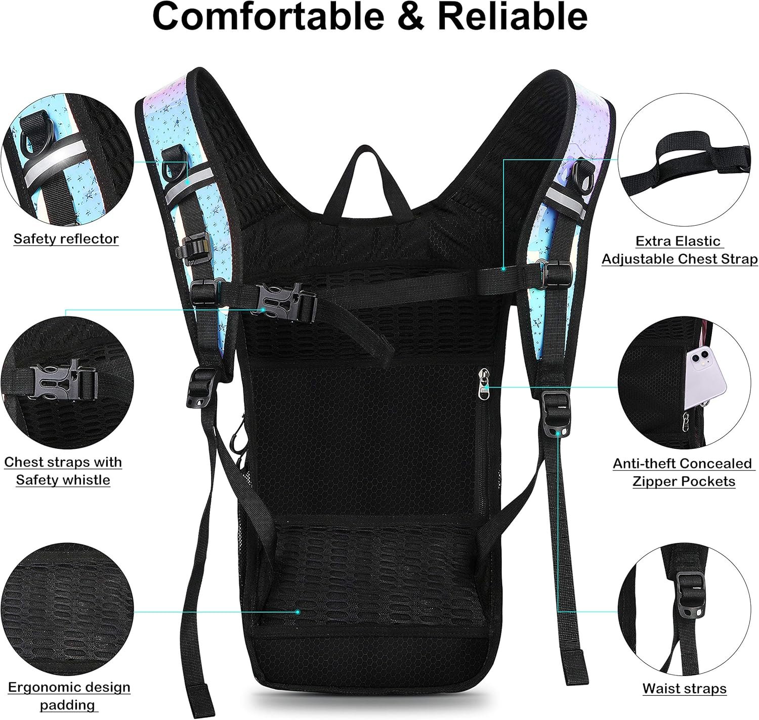 ✨[RAVE HYDRATION BACKPACK SET FOR FESTIVALS & OUTDOORS ADVENTURE]: Included 70-Ounce (2 Liter) BPA FREE & food grade hydration water bladder, Test Report will be sent to your e-mail. Bright colors, unique styles, padded shoulder straps, breathable system and lightweight design are the perfect tool for outdoor sports and Festival day. Specifically designed for those who want to stand out at their next music festival, rave, edm or edc event and anywhere else style is as important as function.