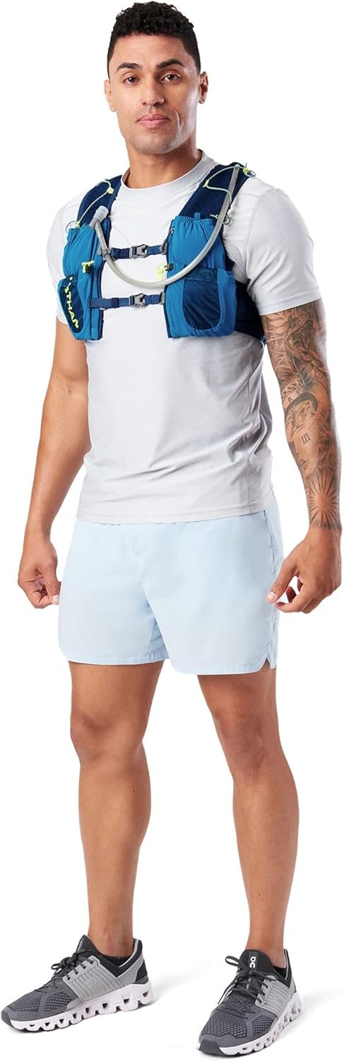 The Vapor Air and Airess 3.0 7L vests are the next generation in the award-winning VaporAir/Airess series. By incorporating new materials, hardware and pocket design, these new Vapor vests are our best version yet. Notable updates include newly exposed air mesh shoulder straps, colorful bungee cords on front shoulders and back center panel for additional storage options, low profile hardware on sternum straps and new back zipper pocket that is easier to access when you’re on the run. Materials: 60% Nylon / 40% Polyester Weight w/o bladder: 8.8oz; Weight with bladder: 13.0oz Capacity: 7L – 427 cu in Care Instructions: Hand wash only – Nathan Power Wash Recommended. To clean bladder remove tubing, rinse tubing and bite valve. Turn bladder inside out and rinse dry standing up.