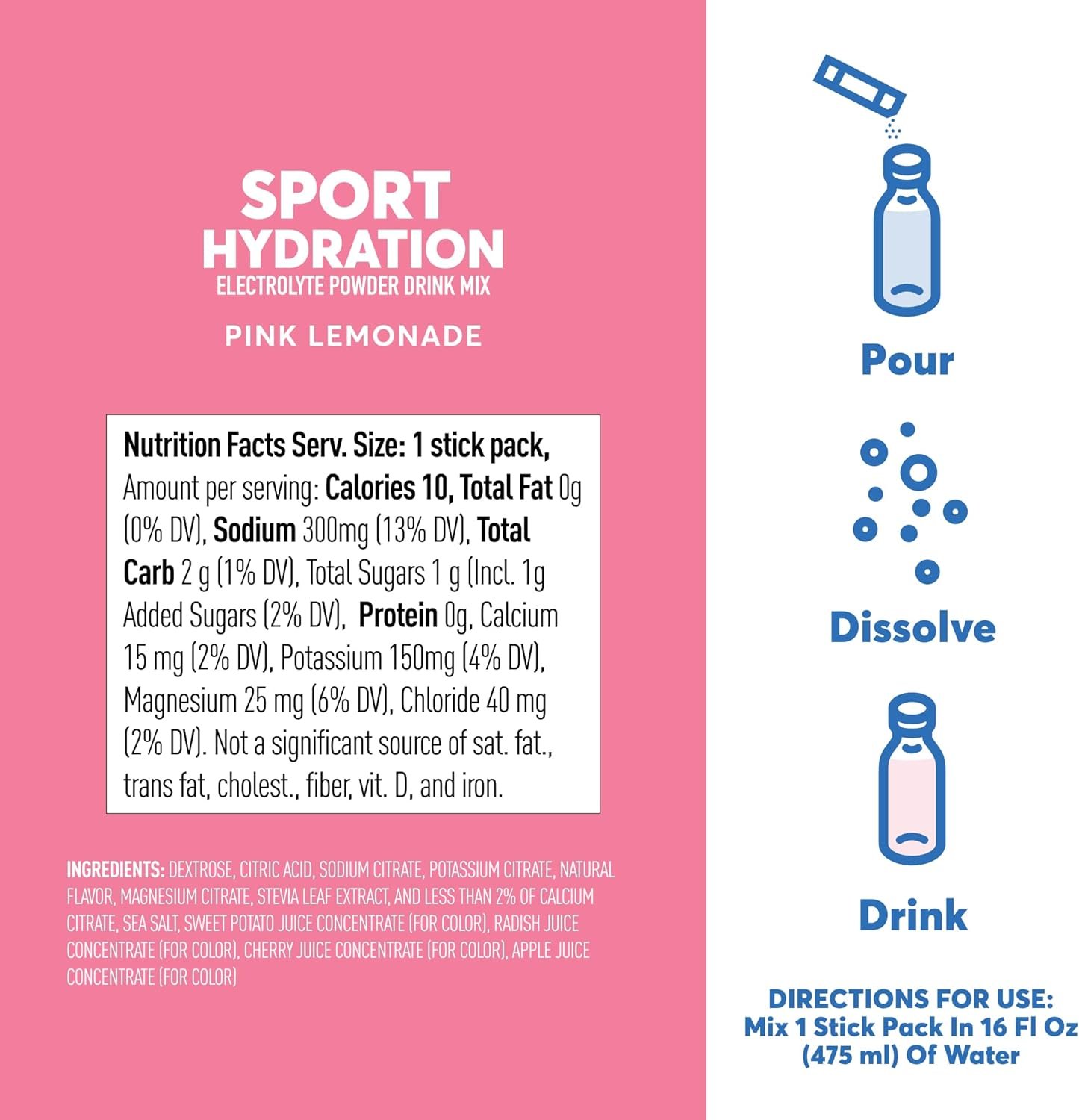 Our best-selling Nuun Sport formula is now available in convenient hydration powder packets for whenever you need a hydration boost on the go. With 1 gram of sugar per serving—90% less than the leading electrolyte drink mix (1)—Nuun Sport Hydration Electrolyte Powder Drink Mix is a perfect addition to your water bottle. This crisp, refreshing hydration drink mix hydrates better than water alone and can be used before, during, and after movement. Like Nuun Sport tablets, our hydration powder contains 5 essential electrolytes to help replace those lost when you sweat. Unlike our popular tablets, this fast-dissolving drink mix contains no effervescence—perfect for those wanting a fizz-free option. Nuun Hydration is on a mission to inspire a happy, active lifestyle, and we believe our principles are as important as our product. Nuun Sport Hydration packets are made with clean (2) ingredients, so you can feel good about bringing this water enhancer along on your next adventure. Contains 16 hydration sticks in Pink Lemonade flavor. (1) This product contains 1g of total sugars per 16 fl oz prepared compared to 11g in the leading electrolyte drink mix. (2) Clean is defined as non-GMO, vegan, and gluten free.