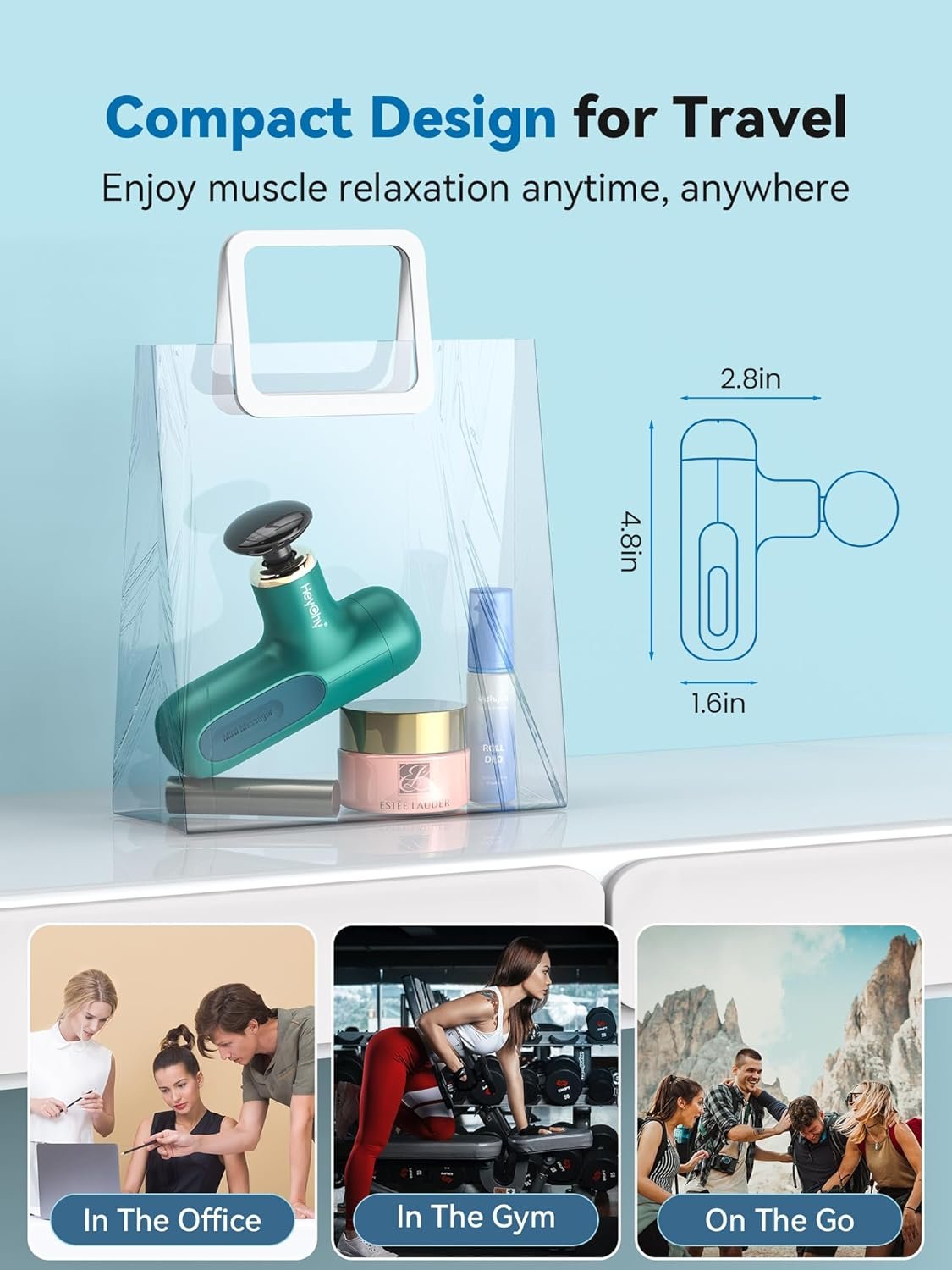 【Mini Design for Your Pocket】Our mini massage gun only weights 0.6lbs, which can be easily put in both bags and pockets. The ergonomic T-shaped design and skin like feel makes you love it, and you can easily carry it in the gym, office and traveling to relax yourself.