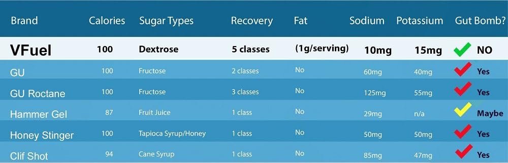 By staying completely, 100% away from Fructose, our formula is the easiest on the stomach, hands down. Yes, this is a bold statement, but we stand by it and our customers can attest to the fact that even the most sensitive stomachs can use VFuel for hours & hours! When compared to other gels, it’s really no comparison-athletes are taking notice. VFuel, like many other energy gels, uses maltodextrin as the primary carbohydrate. But from there, we take a very different path. Most other gels use Fructose, or some sort of rice syrup or evaporated cane juice, all containing Fructose. VFuel uses Dextrose as its secondary carb, which is drastically easier to digest.